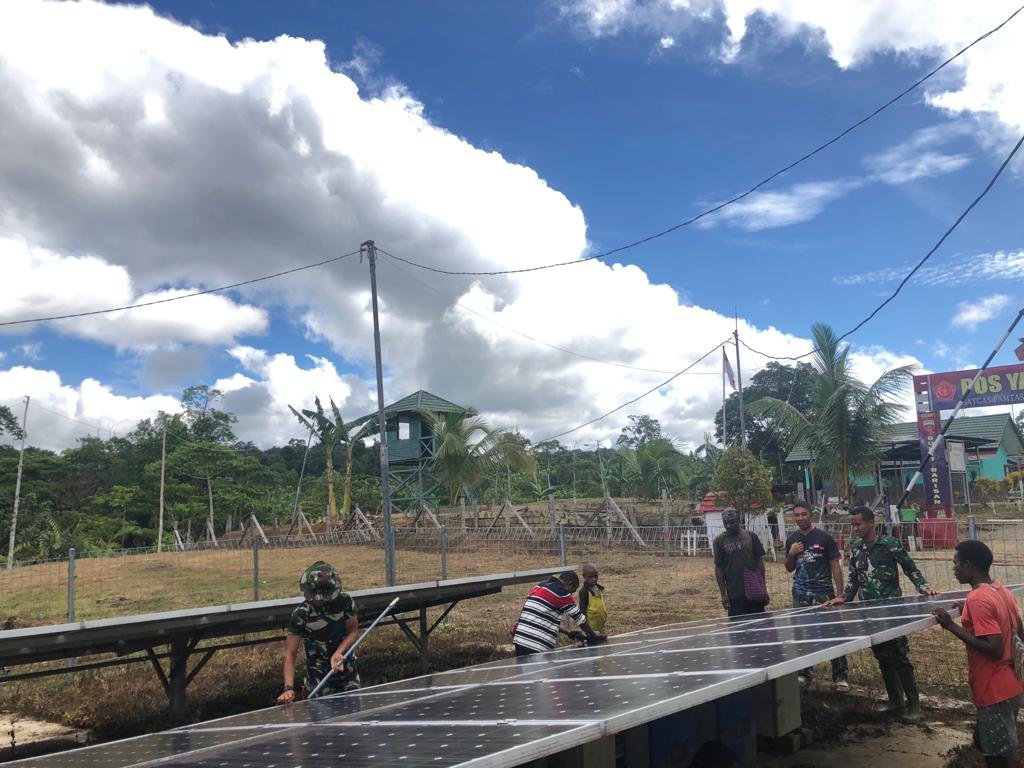 Keerom, siber.news | Membantu mengatasi kesulitan masyarakat di wilayah perbatasan, Prajurit Satgas Pamtas Yonif 126/KC merawat serta memperbaiki Pembangkit Listrik Tenaga Surya (PLTS) yang mengalami kerusakan, Kampung Yabanda di Distrik Yaffi, Kabupaten Keerom.