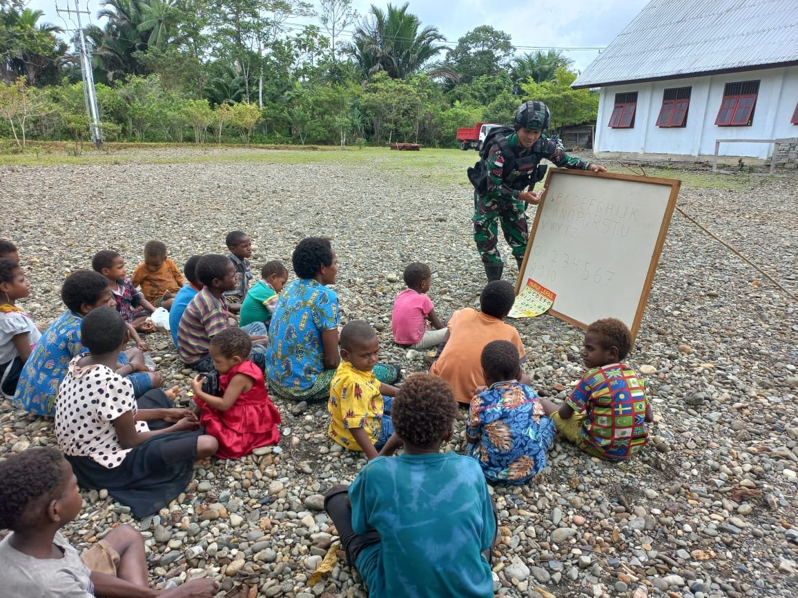 Yahukimo-Papua, siber.news | Guna membangun generasi muda Papua yang tangguh dan berpendidikan, banyak cara yang bisa dilakukan. Satgas Pamtas Yonif Raiderr 142/KJ memberikan pengajaran langsung kepada anak-anak berupa pengenalan huruf Alfabet dan angka-angka di Kampung Kekey, Distrik Dekay, Kab. Yahukimo, Papua, Senin (18/7/2022).