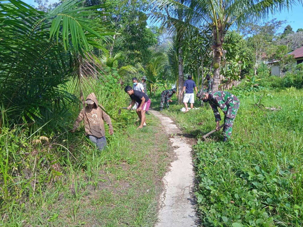 Kalbar, Siber | Untuk menciptakan kenyamanan dalam beribadah, Batalyon Infanteri 642/Kapuas melaksanakan pembersihan sekitar jalan gereja desa ambaong Kec. Kapuas, Kab. Sanggau, Kalbar.