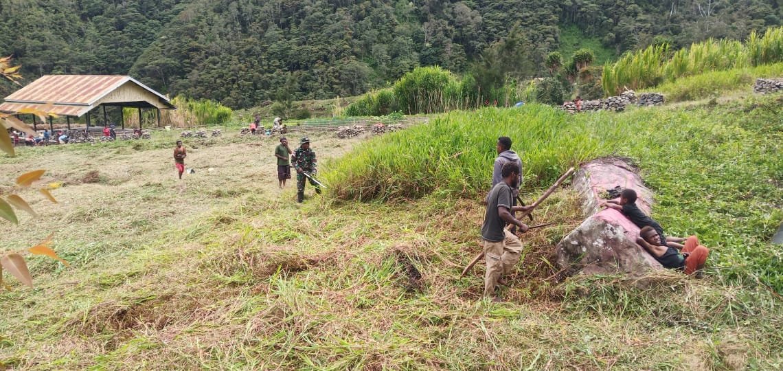 Dipimpin oleh Sertu Yelin Depondoye selaku Wadan Pos Minage bersama 10 personel Satgas mengajak Kepala Desa Minage dan masyarakat untuk sama-sama melakukan kerja bakti dengan membersihkan kantor desa dan jalan yang menuju kantor desa di Distrik Kubu, Kabupaten Tolikara, Papua.