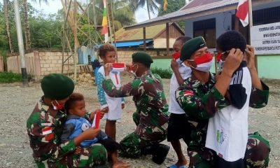 Di Bulan penuh Kasih, Satgas Yonif MR 413 Kostrad Bagikan Kaos dan Masker kepada Anak Perbatasan RI-PNG