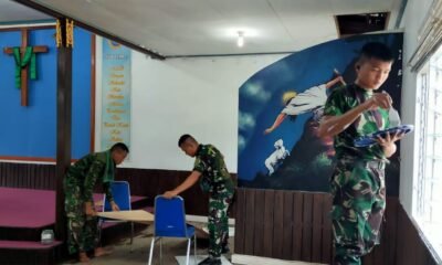 Dukung Kegiatan Keagamaan, Satgas Pamtas Yonif Raider 142/KJ Bersama Jemaat Lakukan Karya Bakti di Gereja