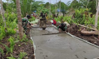 Personel Satgas Pamtas Yonif 642 Bersama Warga Desa Sungai Bening Perbaiki Jalan Setapak