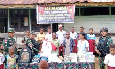 14 Februari 2022Keerom, siber.news | Prajurit Satgas Pamtas RI-PNG Yonif 126/Kala Cakti Pos Somografi memberikan bantuan berupa tas...