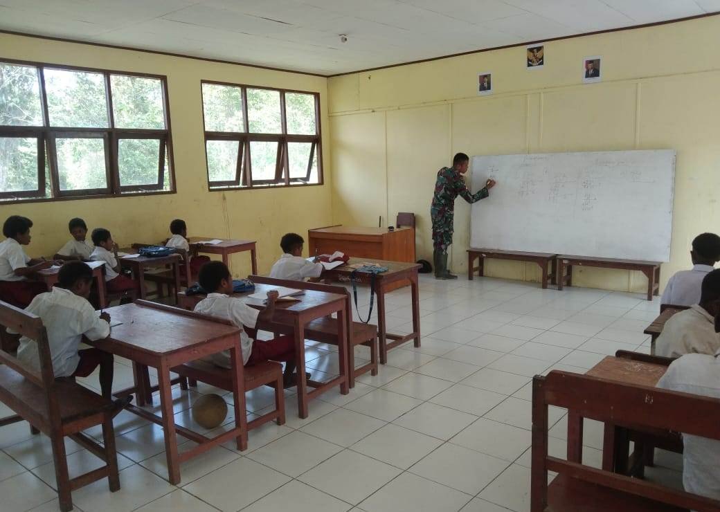 Keerom, siber.news | Personel Satgas Pamtas RI-PNG Yonif 126/KC Pos Bompay, perkuat tenaga pendidik di perbatasan Papua dengan mengajar di Sekolah SD Negeri 1 Bompay, Distrik Waris, Kabupaten Keerom.