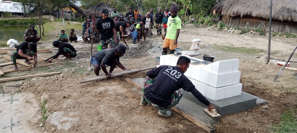 Lanny Jaya, siber.news | Guna menciptakan lingkungan bersih dan indah di Desa Lowanom, Distrik Malagayneri, Satgas Yonif Mekanis 203/AK Pos Malagayneri melaksanakan karya bakti pembangunan dan pembersihan di Desa Lowanom, Distrik Malagayneri, Kabupaten Lanny Jaya, Papua, Kamis (29/09/2022).