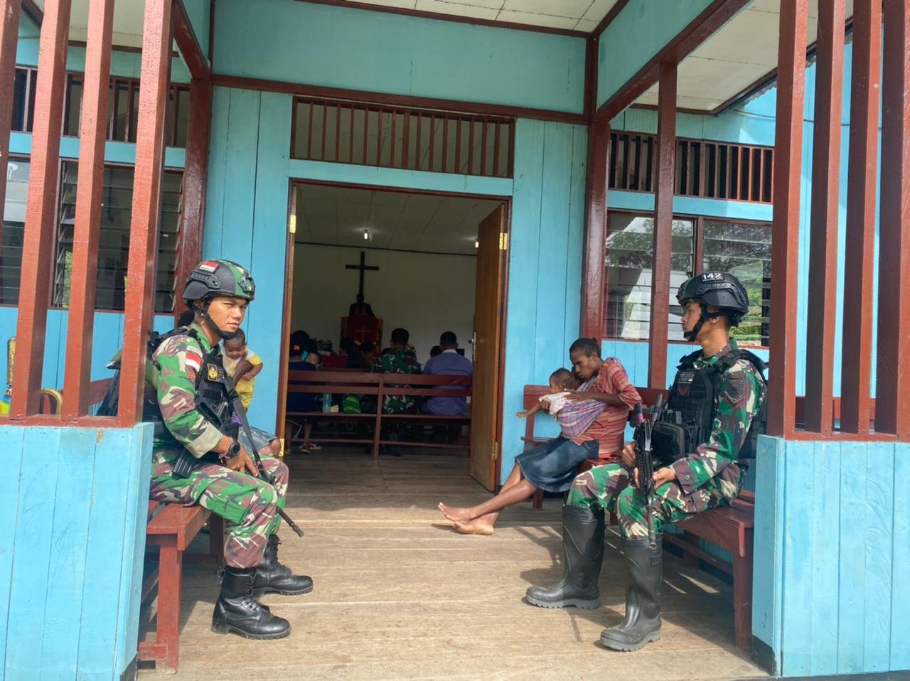 Dabra-Mamberamo Raya, siber.news | Personel Satgas Pamtas RI-PNG Yonif Raider 142/KJ Pos Dabra melaksanakan kegiatan pengamanan Gereja dan melakukan pembersihan Masjid, bertempat di Kampung Dabra, Distrik Mamberamo Hulu, Kabupaten Mamberamo Raya, Papua, Minggu (24/7/2022).