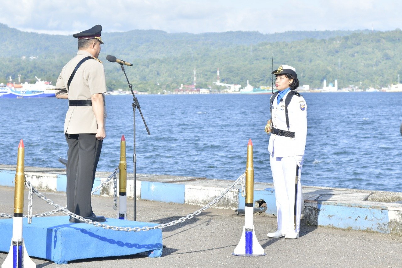 Sebagai Inspektur Upacara Kapolda Maluku Irjen Pol Drs. Lotharia Latif, S.H., M.Hum., dan Komandan Upacara Mayor Laut (K/W) dr. Indriani Mr. Hutagalung, Sp., THT., yang sehari-hari berdinas sebagai Dokter Spesial THT di Rumkital dr. FX. Surhardjo.