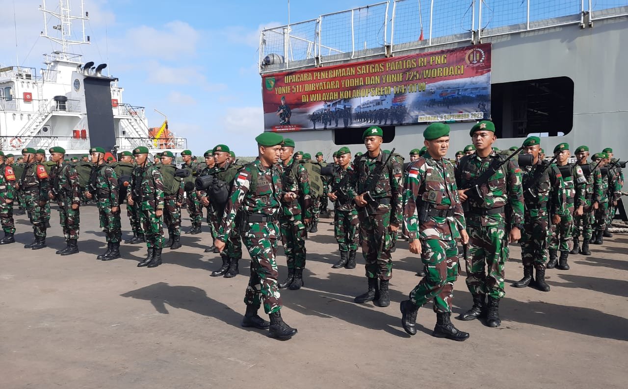 Merauke, siber.news | Danrem 174/ATW  Brigjen TNI E. Reza Pahlevi, S.E yang diwakili Kepala Seksi Operasi (Kasiops) Kasrem 174/ATW Kolonel Inf Irvan Yusri memimpin jalannya upacara penerimaan Satuan Tugas Pengamanan Perbatasan (Satgas Pamtas) RI-PNG Yonif 511/Dibyatara Yodha dan Yonif 725/Woroagi, bertempat di Pelabuhan Yos Sudarso Merauke, Papua Selatan, Jumat (09/09/2022).