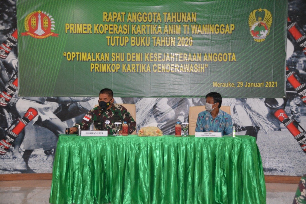 Merauke, Siber. Danrem 174/ATW Merauke Brigjen TNI Bangun Nawoko memimpin Rapat Anggota Tahunan (RAT) dan Tutup Buku Tahun 2020 Primer Koperasi (Primkop) Kartika Anim Ti Waninggap, bertempat di Ruang Rekreasi Makorem 174/ATW, Jumat (29/1/2021).