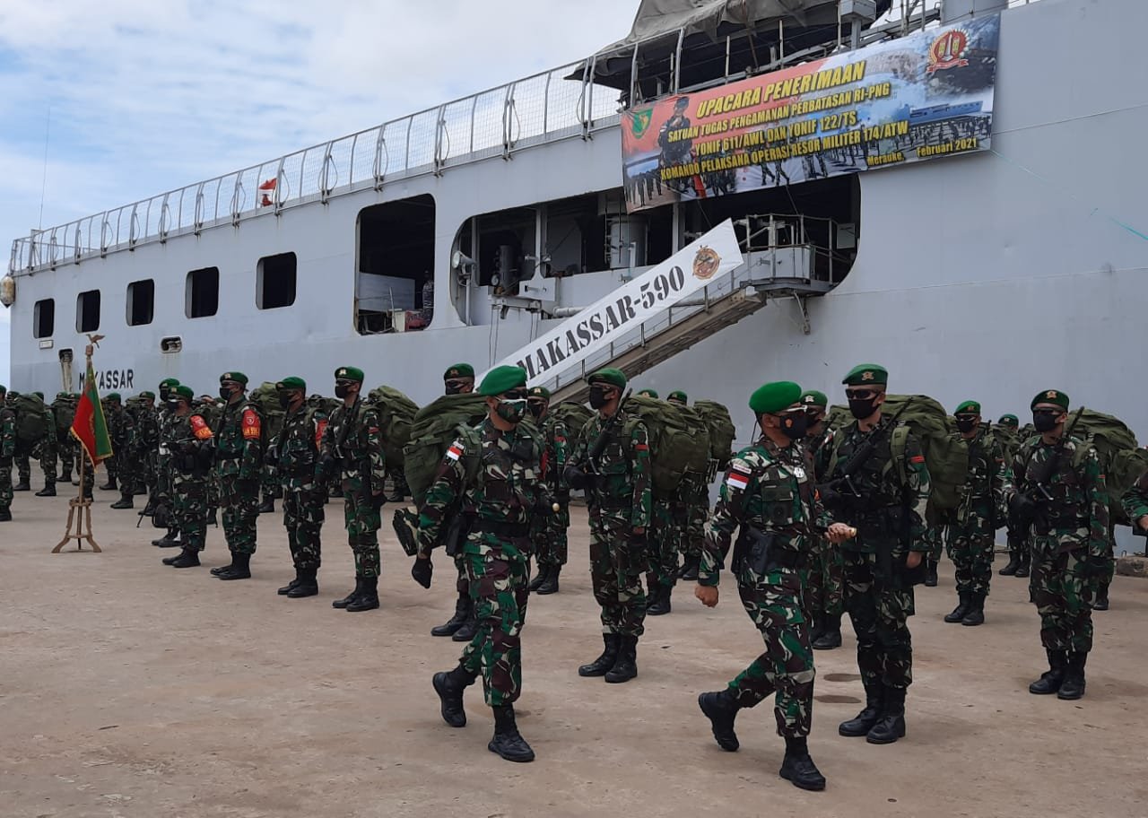 Merauke, Siber. Danrem Merauke Brigjen TNI Bangun Nawoko selaku  Komandan Komando Pelaksana Operasi (Dankolakops) Korem 174 Merauke, memimpin langsung upacara kedatangan pasukan Satuan Tugas Pengamanan Perbatasan (Satgas Pamtas) RI-PNG  di Dermaga Pelabuhan Laut Yos Sudarso Merauke, Kel. Maro, Distrik Merauke, Kab. Merauke, Selasa (2/2/2021).