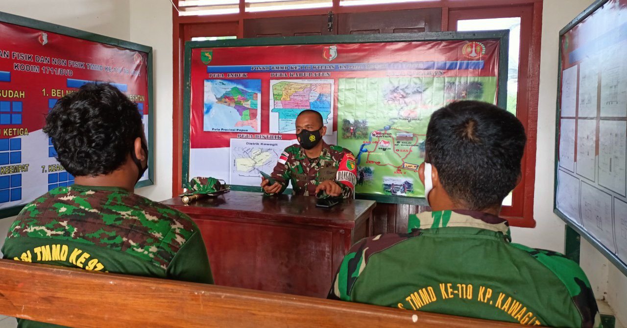 Boven Digoel, Siber | Memasuki satu minggu pelaksanaan TNI Manunggal Membangun Desa (TMMD) Reguler ke-110 Kodim 1711/Boven Digoel, Komandan Kodim 1711/BVD Letkol Czi Daniel Panjaitan selaku Dansatgas TMMD memimpin rapat evaluasi pelaksanaan TMMD, bertempat di Posko TMMD ke-110 Kodim Boven Digoel, Kampung Wanggom, Distrik Kawagit, Kab. Boven Digoel, Rabu (10/3/2021).