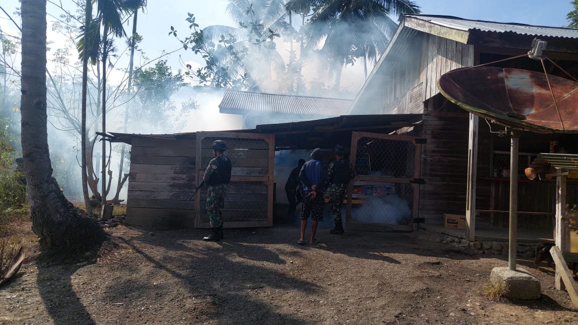 Keerom, siber.news | Sebagai upaya pencegahan dini terhadap penyebaran penyakit malaria dan demam berdarah, Satgas Yonif 126/KC Pos Kalipay melaksanakan pengasapan (fogging) di Kampung Kalipay, Distrik Waris, Kabupaten Keerom.