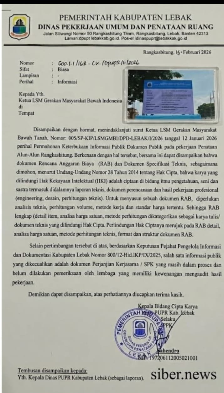 siber.news | Dinas Pekerjaan Umum dan Penataan Ruang (PUPR) Kabupaten Lebak menolak memberikan dokumen Rencana Anggaran Biaya (RAB) proyek Alun-Alun Rangkasbitung senilai Rp4,9 miliar. Melalui surat Nomor: 600.1.1/162-CK/DPUPR/II/2026, Kabid Cipta Karya, Hamdan Suhendro, berdalih bahwa RAB dan Spesifikasi Teknis adalah karya intelektual yang dilindungi Hak Cipta sesuai UU Nomor 28 Tahun 2014, sehingga bersifat rahasia.