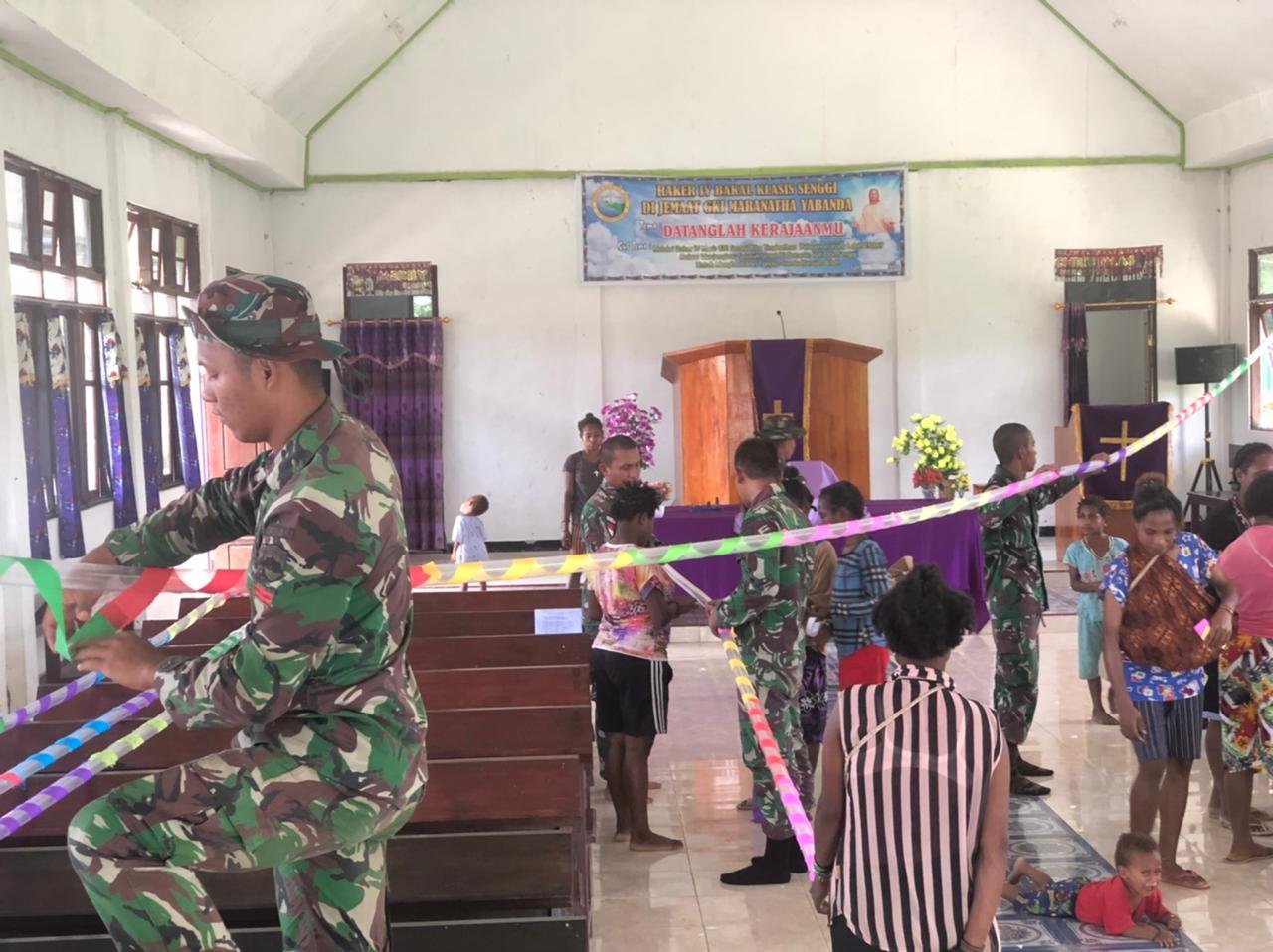 “Kami mewakili jemaat sungguh bahagia, bapak-bapak TNI meringankan langkah dan tenaganya untuk membantu mendekorasi tempat ibadah ini, sikap personel Satgas dalam membantu sesama yang membutuhkan, tanpa melihat perbedaaan dan latar belakang, semuanya bersatu dalam menebar kebaikan harus dapat kita teladani,” tuturnya.