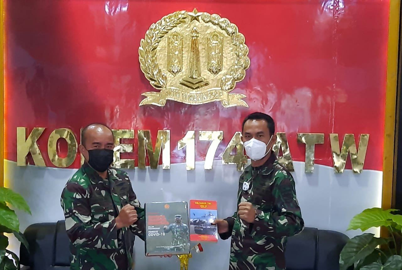 Usai pengumpulan data-data dan dokumen yang dibutuhkan, Ketua Tim Pusjarah TNI Letkol Adm Drs. Abdul Rahman Jamal menyerahkan Buku Sejarah TNI Jilid VI dan Buku Peran TNI dalam penanganan pandemi Covid-19 kepada Kolonel Inf Rudi Firmansyah didampingi Kepala Seksi Logistik (Kasilog) Korem 174 Merauke Kolonel Arm Ayi Yosa Karya.W, S.Sos., dilanjutkan foto bersama. Selama kegiatan berlangsung tetap mematuhi protokol kesehatan Covid-19.