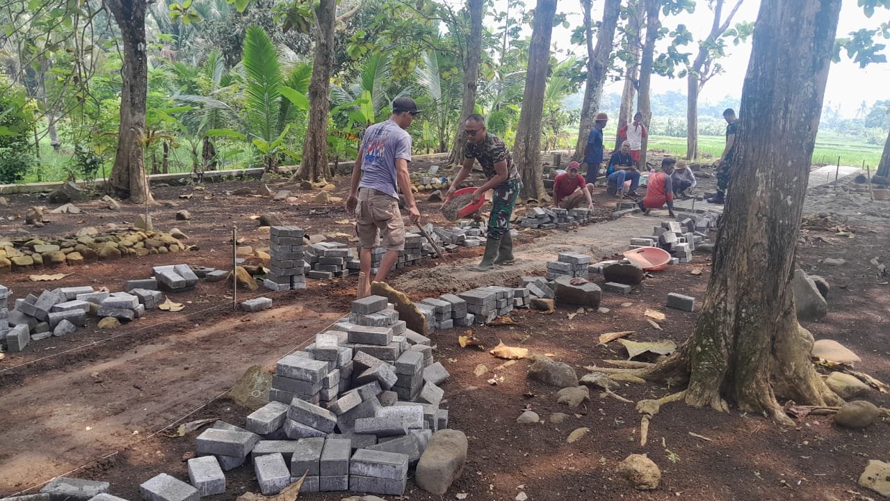 siber.news | Koramil 0104 Kecamatan Cimanuk Kodim 0601 Pandeglang melaksanakan kerja bakti pemasangan paving block untuk jalan sepanjang 100 meter pada hari Selasa (12/08/2025) bertempat di TPU Cihideung Barat Desa Batubantar Kec. Cimanuk Kab. Pandeglang.