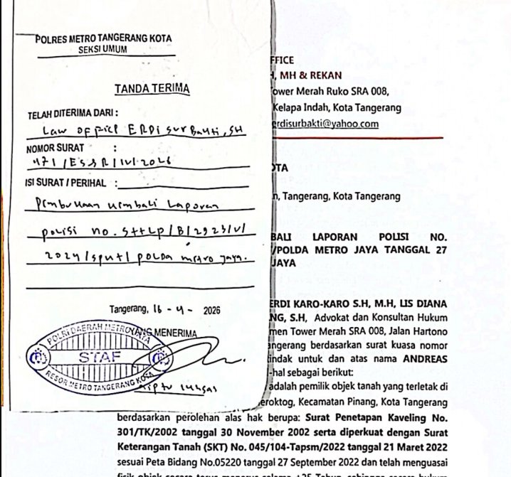 siber.news – Kuasa hukum Andreas Tarmudi resmi melayangkan surat keberatan dan permohonan pembukaan kembali laporan polisi terkait kasus dugaan penyerobotan lahan di Kavling DPR Neroktog. Langkah ini diambil setelah Polres Metro Tangerang Kota mengeluarkan Surat Penghentian Penyidikan (SP3) yang dinilai mencederai rasa keadilan.