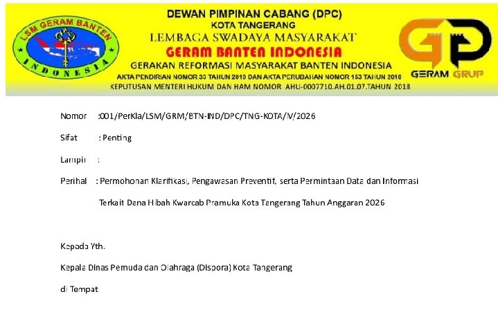 siber.news | Lembaga Swadaya Masyarakat Gerakan Reformasi Masyarakat (LSM GERAM) Banten Indonesia menyurati Dinas Pemuda dan Olahraga (Dispora) Kota Tangerang. Surat tersebut berisi permohonan klarifikasi dan permintaan data terkait penyaluran dana hibah tahun anggaran 2026 sebesar Rp800 juta yang dialokasikan untuk Kwartir Cabang (Kwarcab) Gerakan Pramuka Kota Tangerang.