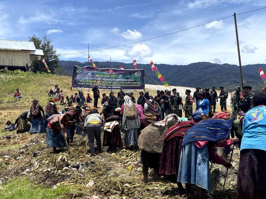 Lanny Jaya, siber.news |  Personel Satgas Yonif Mekanis 203/AK yang dipimpin langsung oleh Dansatgas Letkol Inf Achmad Zaki, S.Sos.,M.M.,M.I.Pol mengadakan acara adat bakar batu dalam rangka memperingati HUT TNI Ke-77 di Distrik Tiom, Kabupaten Lanny Jaya, Rabu (5/10/2022).