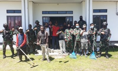 Prajurit TNI Bersama Masyarakat Melaksanakan Pembersihan Kantor Pemerintahan Distrik Walesi