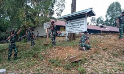 Peduli Pendidikan, Personel Yonif 642/Kapuas Bersihkan Lingkungan SD Negeri 03 Semitau Hilir