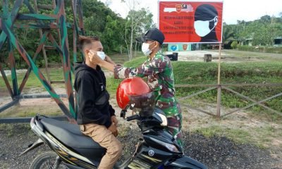 Satgas Pamtas RI-Malaysia Yonif 642 Bagikan Masker kepada Pengendara Bermotor