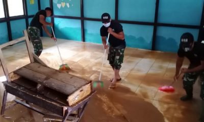 Personel Satgas Pamtas Yonif 642 Bersama Warga Bersihkan Sampah dan Lumpur Pasca Banjir