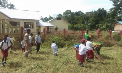 Terapkan Hidup Sehat, Prajurit Satgas Yonif MR 413 Ajarkan Siswa SD Perbatasan RI-PNG Bersihkan Lingkungan