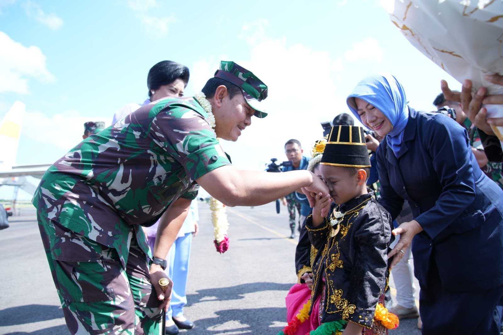Sebelumnya saat memasuki wilayah udara Madiun, Panglima TNI yang menggunakan Pesawat Boeing 737 A-7308 mendapatkan pengawalan langsung Pesawat Tempur F-16 Fighting Falcon dan T-50i Golden Eagle. Pengawalan oleh pesawat tempur itu sebagai bentuk tradisi penyambutan kepada Panglima TNI yang pertama kali berkunjung ke Lanud Iswahjudi.