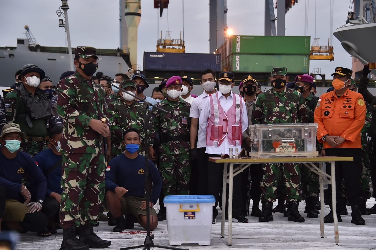 Jakarta, siber- Panglima TNI Marsekal TNI Hadi Tjahjanto, S.I.P. bersama Menteri Perhubungan (Menhub) Budi Karya Sumadi, Kepala Staf Angkatan Laut (Kasal) Laksamana TNI Yudo Margono, S.E., M.M., Kepala Badan Nasional Pencarian dan Pertolongan (Kabasarnas) Marsdya TNI Bagus Puruhito dan Ketua Komite Nasional Keselamatan Transportasi (KNKT) Soerjanto Tjahjono, menggelar konferensi pers terkait ditemukannya Flight Data Recorder (FDR) pesawat Sriwijaya Air SJ-182, bertempat di Dermaga JICT II, Tanjung Priok, Jakarta Utara, Selasa (12/1/2021).