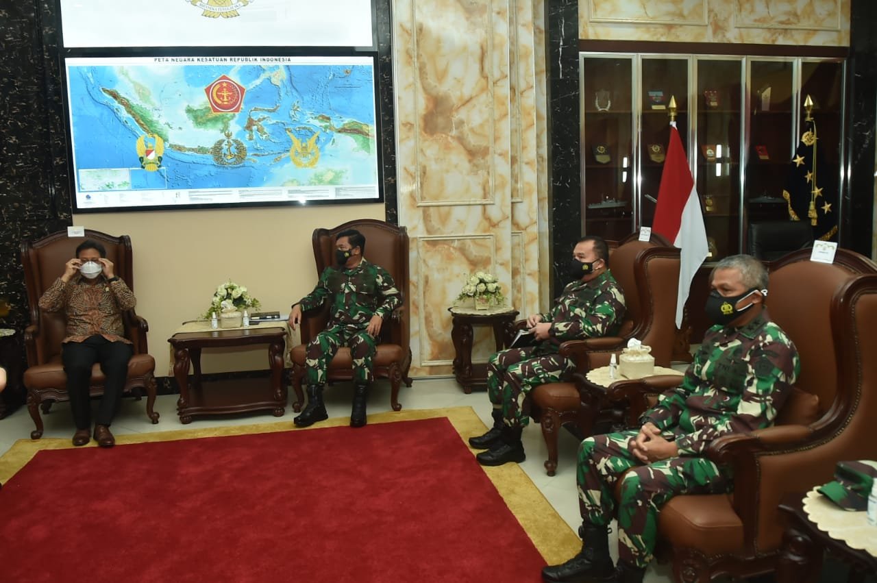 Jakarta, Siber. Panglima TNI Marsekal TNI Hadi Tjahjanto S.I.P., didampingi Asops Panglima TNI Mayjen TNI Tiopan Aritonang, Kapuskes TNI Mayjen TNI Tugas Ratmono, Kapuspen TNI Mayjen TNI Achmad Riad dan mantan Kapuskes TNI Mayjen TNI (Purn) dr. Ben Yura Rimba, MARS, menerima kunjungan Menteri Kesehatan (Menkes) RI Ir. Budi Gunadi Sadikin, bertempat di Subden Denma Mabes TNI, Jalan Merdeka Barat, Jakarta Pusat, Kamis (31/12/2020).