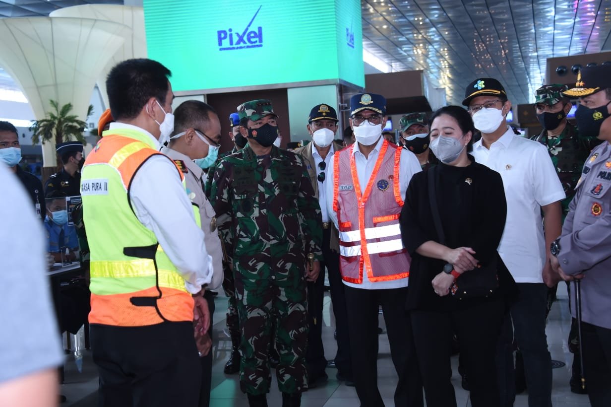 Jakarta, Siber | Panglima TNI Marsekal TNI Hadi Tjahjanto, S.I.P. bersama Kapolri Jenderal Polisi Drs. Listyo Prabowo, M.Si., Ketua DPR RI Puan Maharani, Menteri Kesehatan (Menkes) Budi Gunadi Sadikin, Menteri Perhubungan (Menhub) Budi Karya Sumadi dan Kepala Badan Nasional Penanggulangan Bencana (BNPB) Letjen TNI (Purn) Doni Monardo meninjau lokasi posko Penyekatan Mudik 2021 di Terminal 3 Bandara Soetta Tanggerang Provinsi Banten dan Posko Penyekatan Arus Mudik di Gerbang Tol Cikarang Barat Km 31 Kabupaten Bekasi, Jawa Barat, Rabu (12/5/2021).