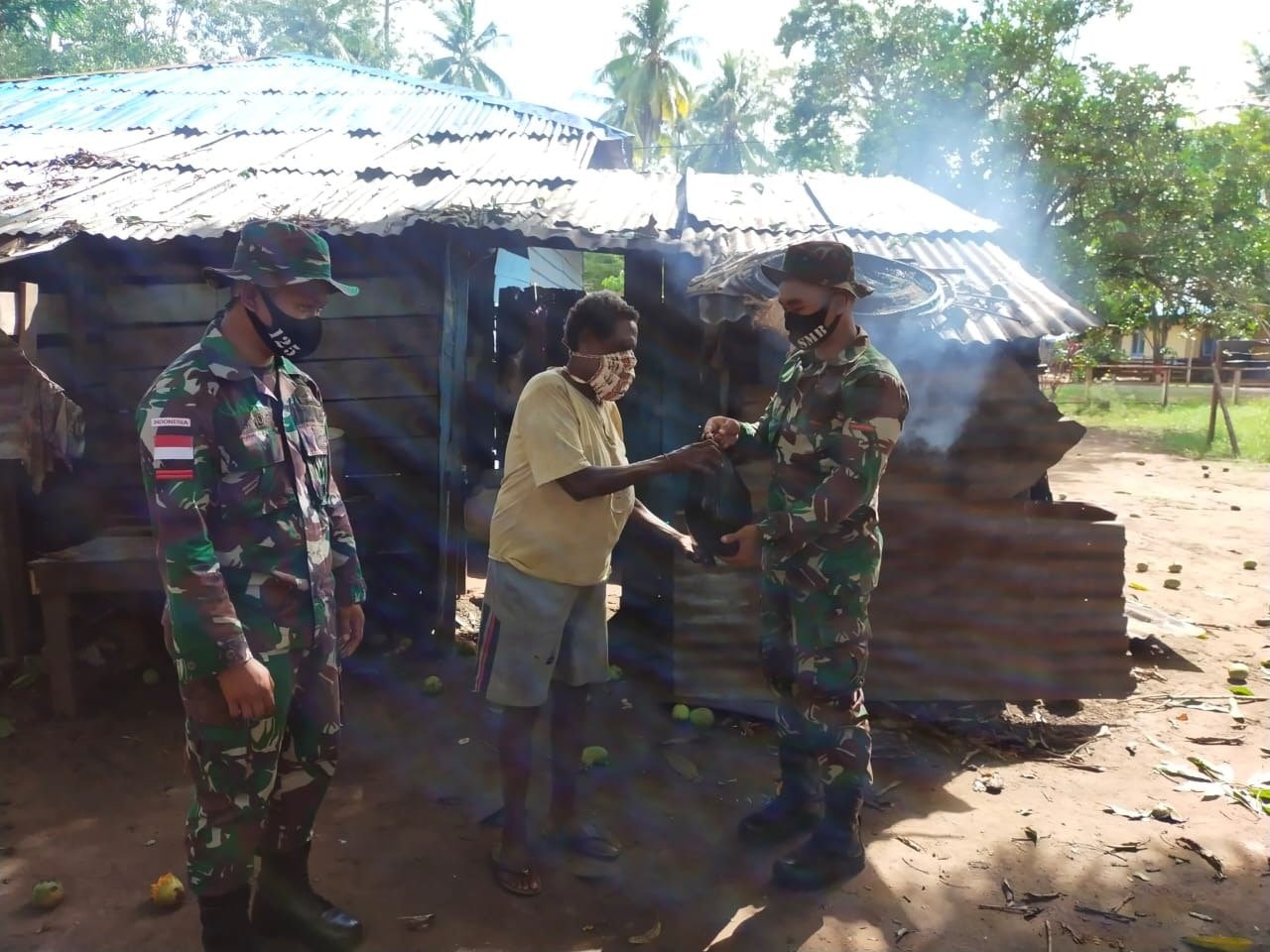 Merauke, Siber. Sebagai wujud perhatian dan kepedulian terhadap sesama, Satgas Pamtas RI-PNG Yonif 125/Simbisa di bawah kendali Komando Pelaksana Operasi Korem 174/ATW membagikan bingkisan Natal berupa sembako kepada warga Kampung Yanggandur, Distrik Sota, Kabupaten Merauke, Papua, Selasa (22/12/2020).