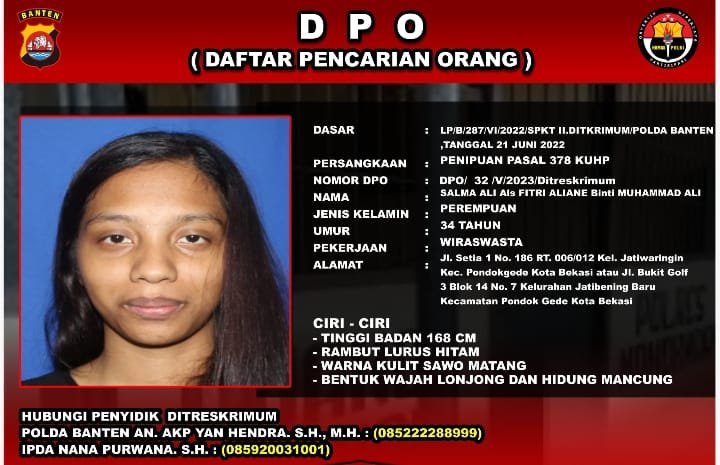 Dalam surat DPO tersangka Wanita bernama Salma Ali alias Fitri Aliane binti Muhammad Ali, sebelumnya telah dilaporkan korban kepada Ditkrimum Polda Banten dengan no LP/B/287/VI/2022/SPKT II.DITKRIMUM/POLDA/BANTEN, pada tanggal 21 JUNI 2022 lalu.