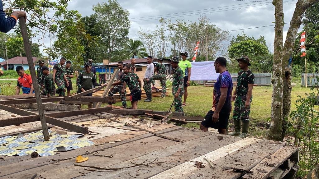 Prajurit Pos Senggo Yonif Raider 600/Modang bersama masyarakat bergotong royong bahu-membahu melaksanakan pembangunan rumah milik Ibu Erma Kaimu yang kondisinya memprihatinkan. Ibu Erma tinggal bersama dua orang anak yang bernama Natalia dan Keli, karena suami dari Ibu Erma Kaimu tersebut sudah meninggal dunia.