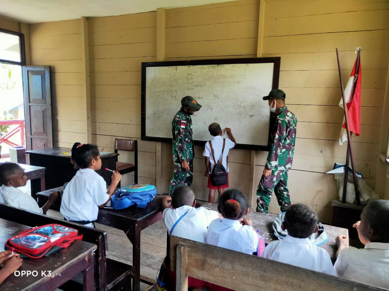 Jayapura-Papua, Siber | Prajurit TNI dari Yonif 131/Braja Sakti yang tergabung dalam Satgas Pamtas RI-PNG, memberikan bantuan menjadi tenaga pendidik di Sekolah Dasar (SD) Inpres Kibay di Kampung Kibay, Distrik Asro Timur, Kab. Keerom, Jayapura, Papua, Selasa (30/3/2021).