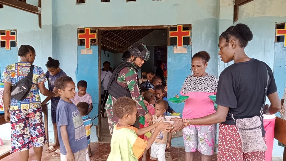 “Satgas Yonif 126/KC Pos Yabanda membagikan 150 Kg beras dan 5 karton meal ready to eat (MRE) atau makanan siap saji jenis Naraga untuk membantu warga dan anak-anak yang sedang mengikuti kegiatan Camping Paskah”, jelas Dansatgas.