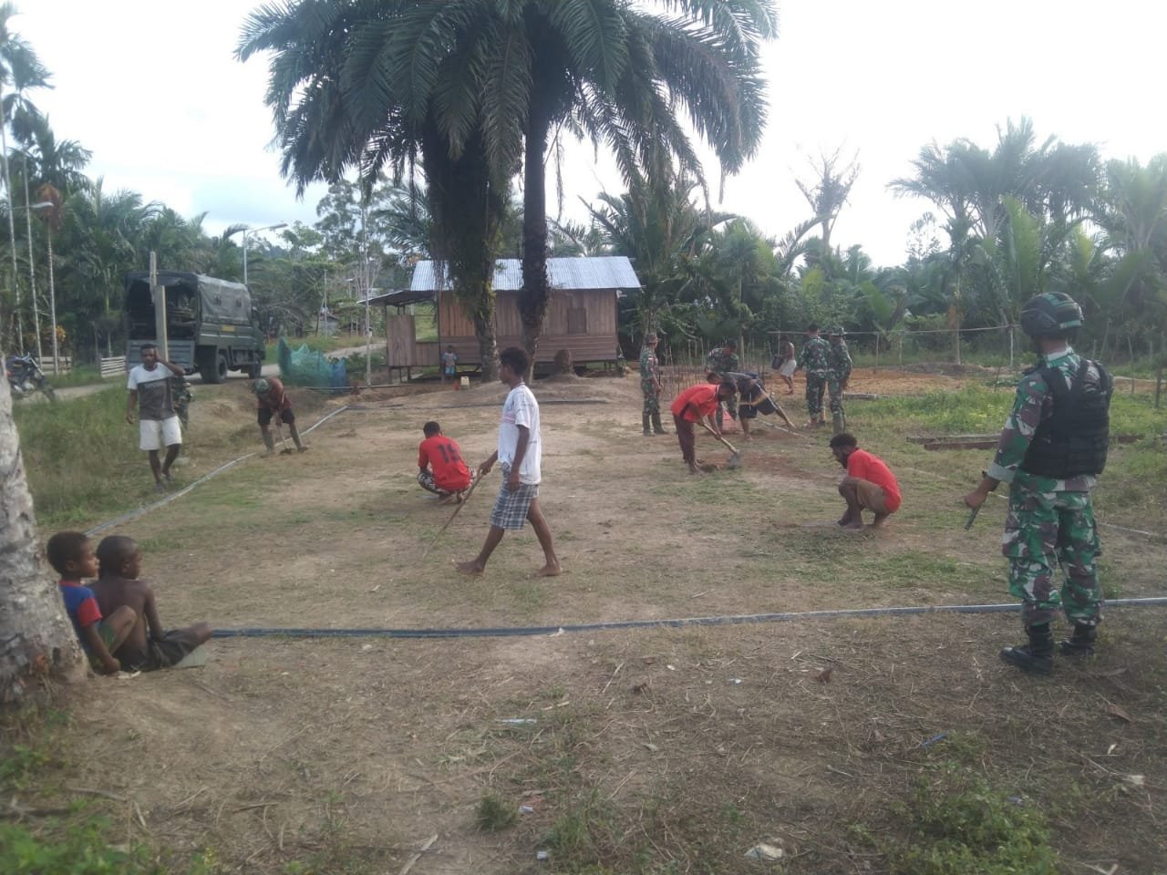 Keerom, siber.news | Pos Yuruf Satgas Pamtas Yonif 126/KC mengajak masyarakat melakukan karya bakti pembersihan lapangan Voli di Kampung Yuruf, Distrik Yaffi, Kabupaten Keerom, Papua.