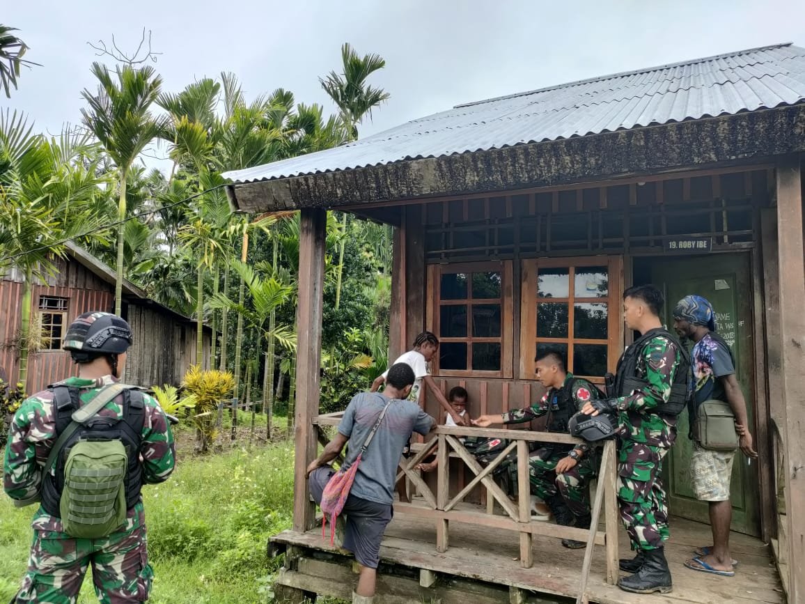 Keerom, siber.news | Mempererat tali silaturahmi dengan masyarakat di perbatasan Papua, Satgas Pamtas RI-PNG Yonif 126/KC secara rutin melaksanakan kegiatan Komsos (Komunikasi Sosial) ke rumah warga di Kampung Kalilapar, Distrik Waris, Kabupaten Keerom, Rabu (23/2/2022).