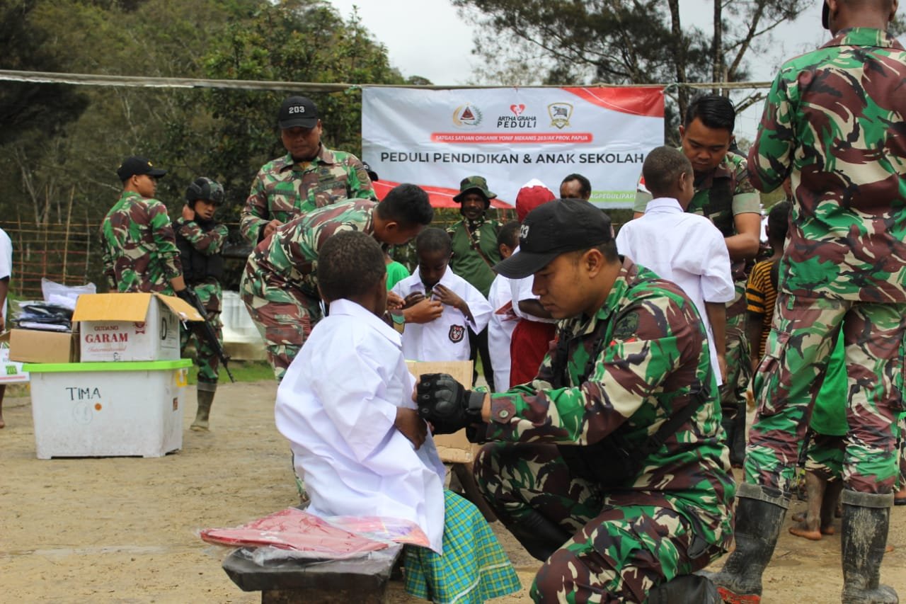 Satgas Yonif Mekanis 203/AK Bekerja Sama Dengan Artha Graha Membagikan Perlengkapan Sekolah Untuk Anak-Anak Pegunungan Tengah