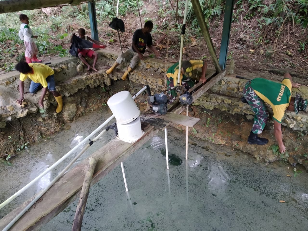 Satgas Yonif MR 413 Bersama Masyarakat Perbatasan RI-PNG Bersihkan Sumber Air