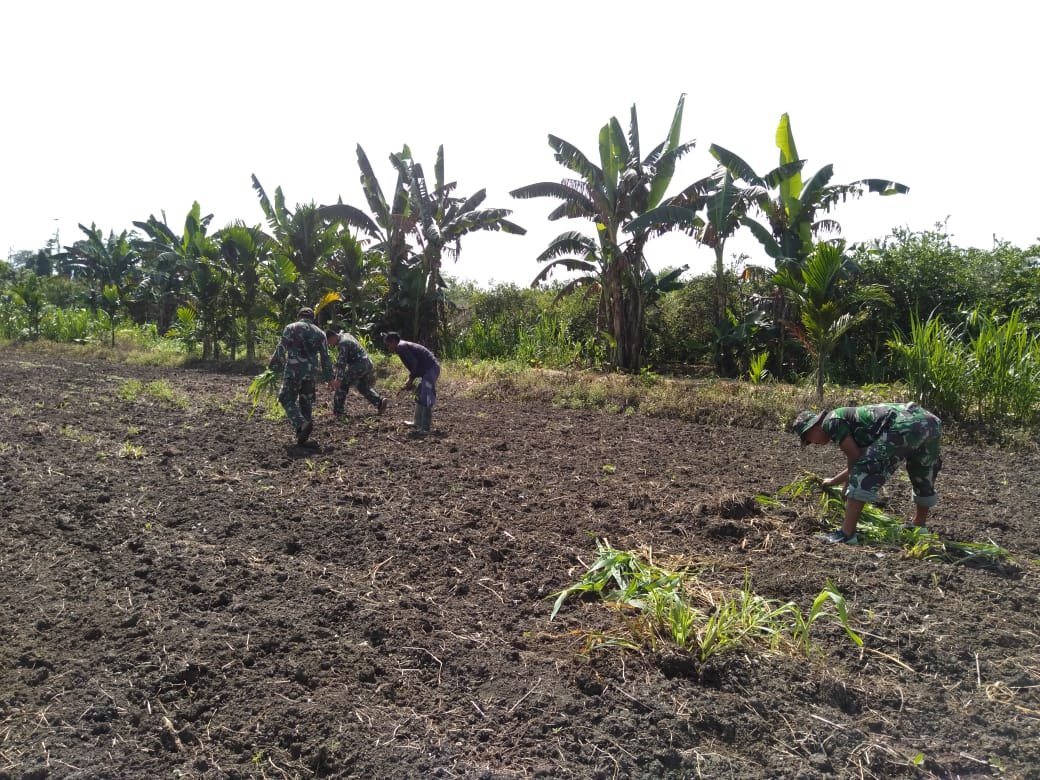 Jayapura,siber- Dalam upaya menstabilkan ketersediaan bahan pokok makanan di masa pandemi Covid-19, Satgas Pamtas RI-PNG Yonif Mekanis Raider 413 Kostrad Pos Kout KM 31 membantu warga Kampung Sanggaria Distrik Arso Kabupaten Keerom menanam pohon pisang.
