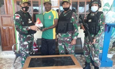Jelang Purna Tugas, Satgas Yonif MR 413 Kostrad Berikan Masyarakat Cinderamata Berupa Topi dan Plakat