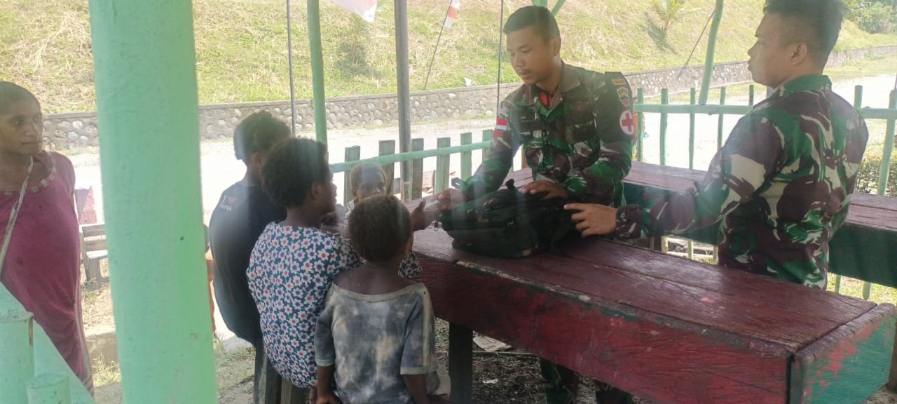 Keerom, siber.news | Satgas Pamtas RI-PNG Yonif 126/KC Pos Kalimao melayani pengobatan gratis di Kampung Kalimao, Distrik Yaffi, Kabupaten Keerom.