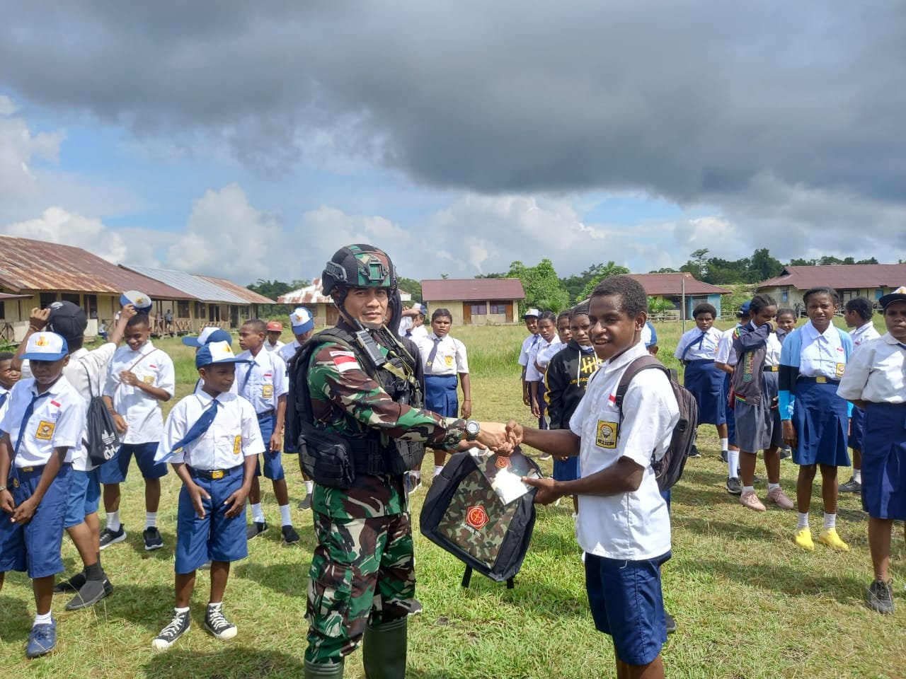 Keerom, siber.news | Meningkatkan semangat dan motivasi belajar anak-anak di wilayah perbatasan RI-PNG, Dansatgas Yonif 126/KC Letkol Inf Dwi Widodo, S.H., M.Han. membagikan perlengkapan sekolah dan sarana olahraga kepada siswa SMP N 1 Senggi, Kabupaten Keerom.