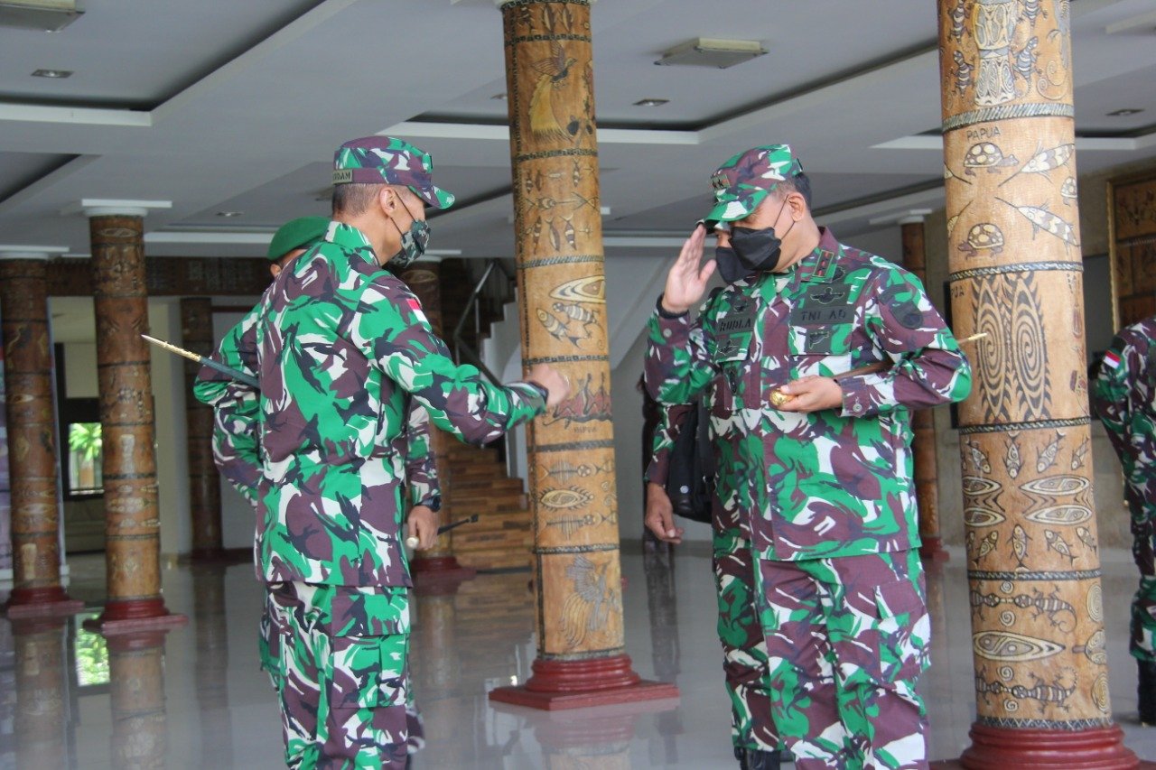 Jayapura, Siber | Dalam rangka meningkatkan sinergitas, Pangdam XVII/Cenderawasih Mayjen TNI Ignatius Yogo Triyono, M.A, didampingi oleh para pejabat Kodam XVII/Cenderawasih menerima kunjungan Pangdam IV/Diponegoro Mayjen TNI Rudianto beserta rombongan di Ruang Cycloops Makodam XVII/Cenderawasih, Senin (25/10/2021).