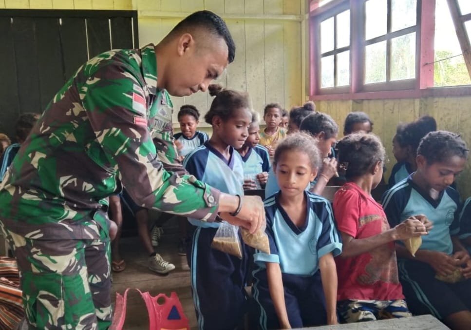 Keerom, Siber | Sebagai wujud perhatian dan kasih sayang terhadap anak-anak di pedalaman Papua, Satgas Yonif 143/TWEJ berbagi kebahagiaan dengan membagikan makanan tambahan dalam rangka memberikan pembelajaran tentang budipekerti dan pentingnya kebersamaan kepada siswa di SDN Inpres Yabanda, Kampung Yabanda, Distrik Yaffi, Kab. Keerom, Papua, Sabtu (18/03/2023).