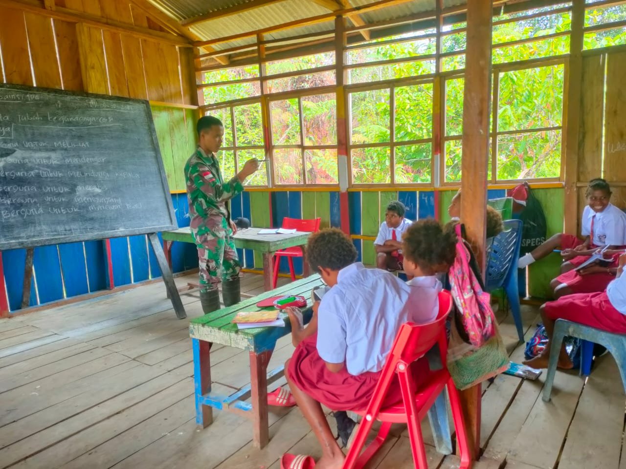 Turut Serta Cerdaskan Anak Bangsa, Satgas Yonif 126/KC Jadi Tenaga Pendidik Di Perbatasan Papua