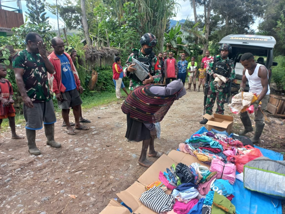 Dalam kegiatan pembagian baju tersebut, Ibu Helena Yelipele, 50 tahun menyampaikan rasa terima kasihnya kepada personel Satgas yang telah memberikan baju baru dan baju layak pakai kepada warga.